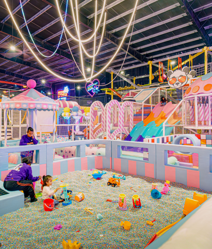 A safe and colourful kids play zone filled with slides, ball pools, and interactive games, ideal for children to stay active and enjoy playful indoor fun while families relax inside the game zone.